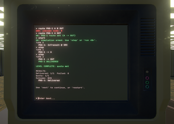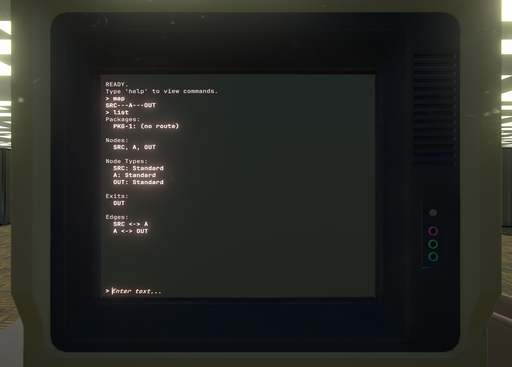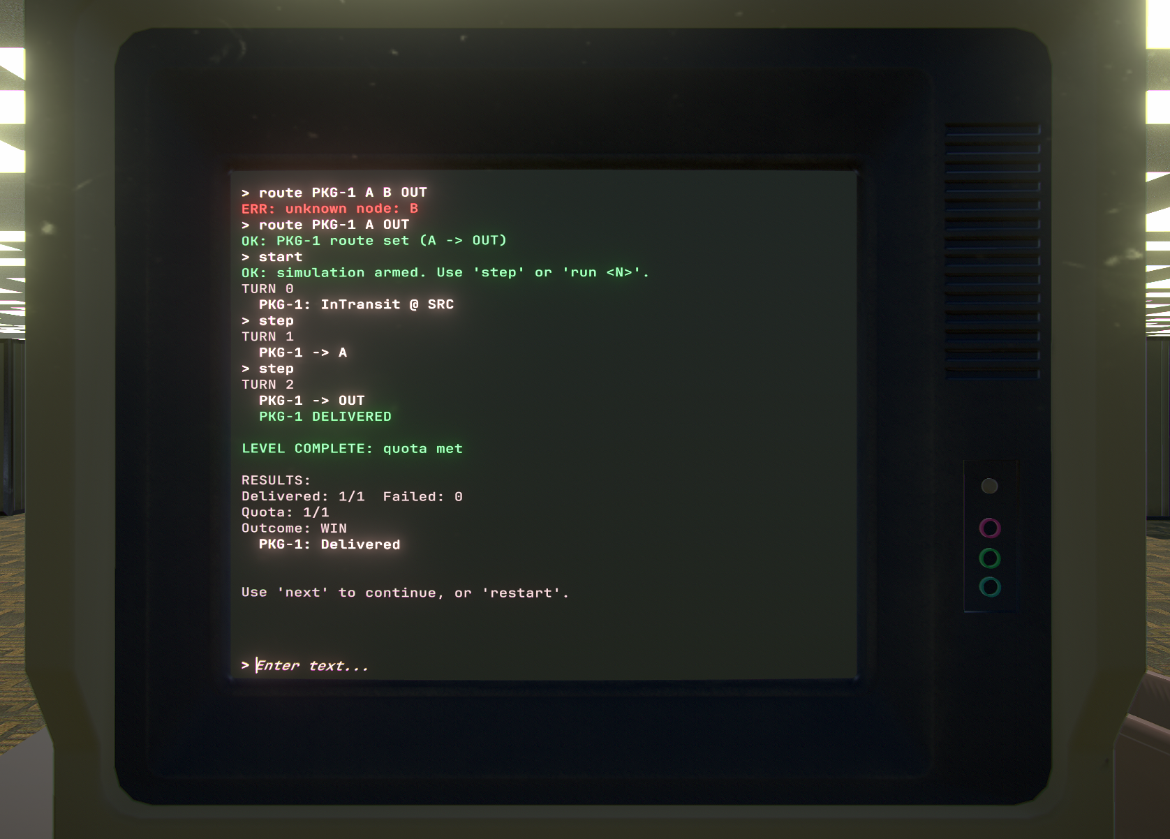 Routing Exception is a systems driven puzzle game disguised as a command line interface. You are given a network map, a queue of packages, and a set of strange machine behaviors. Your task is to assign routes, simulate delivery cycles, and meet quota.